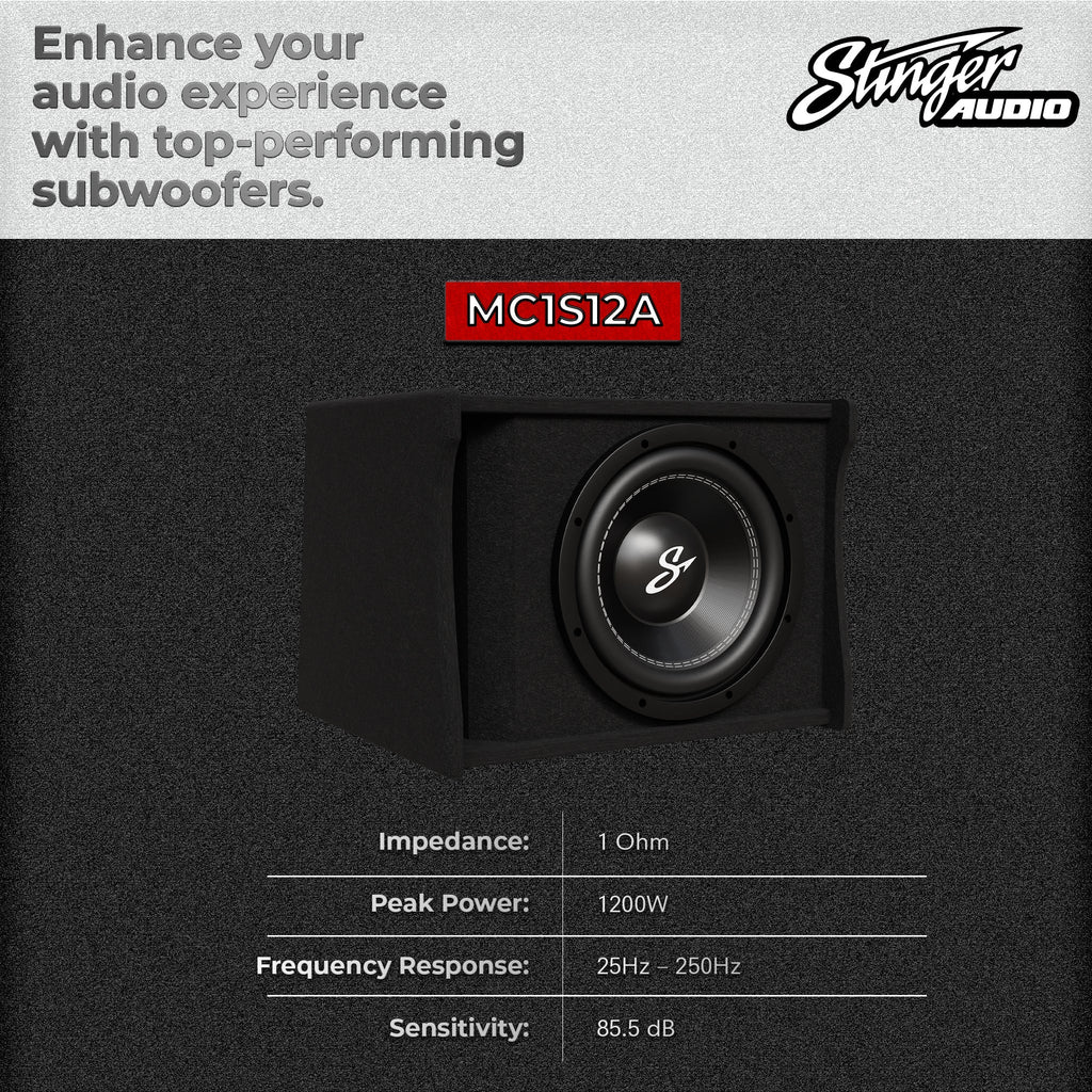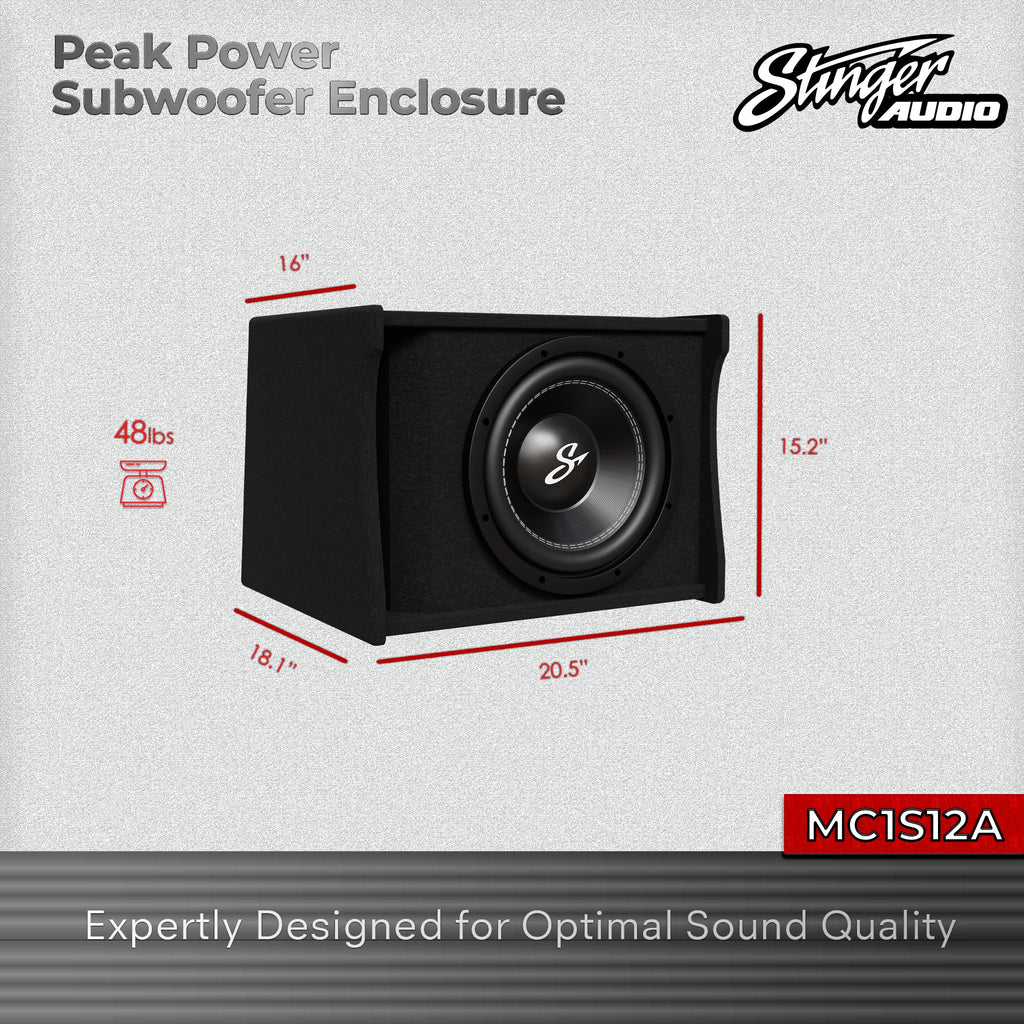 Experience the power and precision of the MC1 Series by Stinger Audio. Designed specifically for loaded, ported subwoofer enclosures, this addition to your car sound system will elevate your audio to new heights. With a peak power of 1,200 watts and a 12" subwoofer, the MC1 series delivers deep, rich bass that will make every beat come alive. Built to last with robust construction and durable materials, this subwoofer enclosure is ready to withstand the demands of daily use. Its perfect fit for most vehicles and preloaded high-quality subwoofers ensure a seamless and satisfying audio experience right out of the box. Boost your ride audio with the MC1 Series Loaded Subwoofer Enclosure from Stinger Audio!