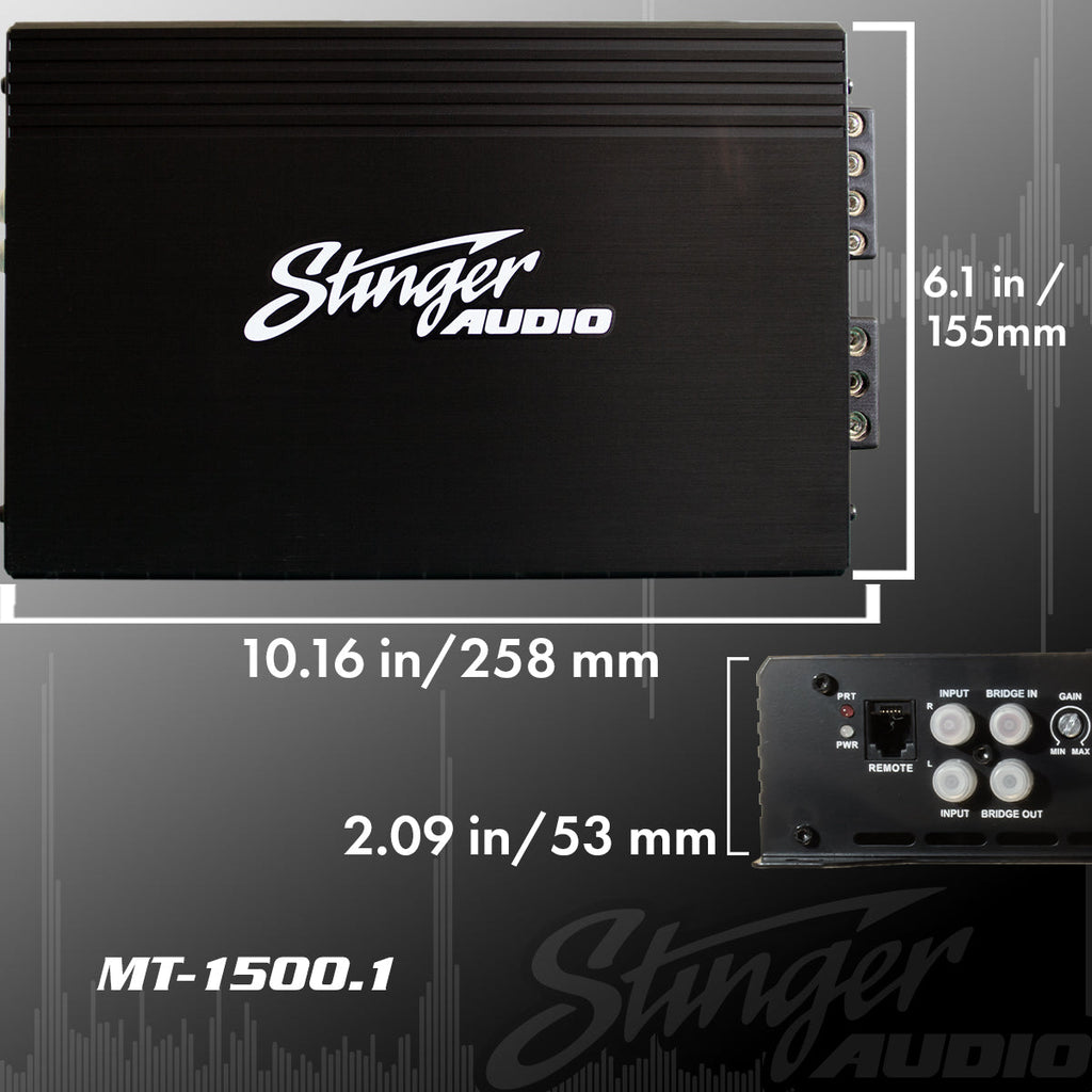 Ready to amp up your audio? Look no further than the Stinger Audio's MT1500.1 Monoblock amplifier! Boasting an impressive 1500-Watts RMS power at 1 ohm, enjoy thumping bass in any vehicle. With robust features such as MOSFET power supply, high-quality capacitors, advanced transformers, and leading-edge inductors you can count on peak performance and reliability with this state of art system. Get your monstrous low end today with no compromises on quality or performance!