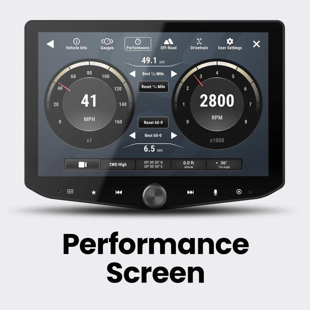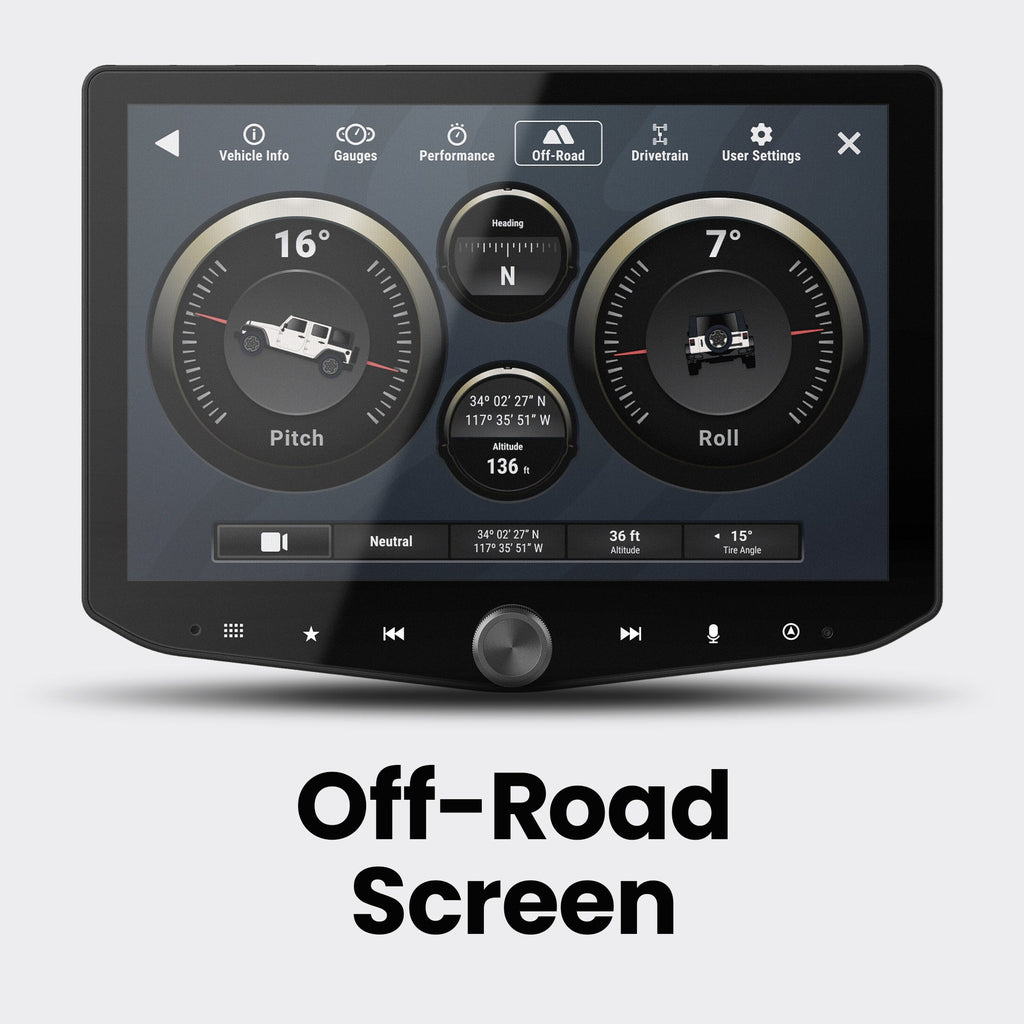 On-Screen Vehicle Gauges: Customizable, vehicle-specific screens for real-time gauges, drivetrain, vehicle info, performance, and off-road data like transfer case, position, altitude, and steering angle.