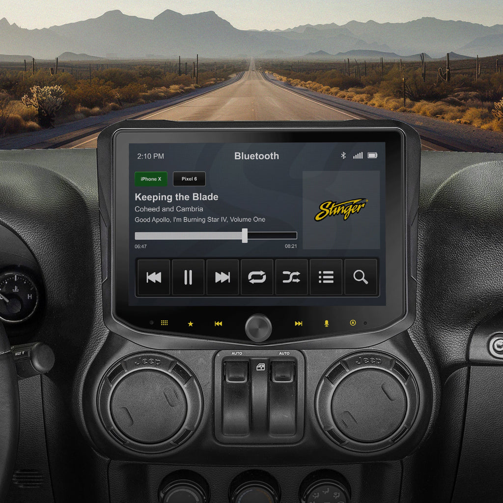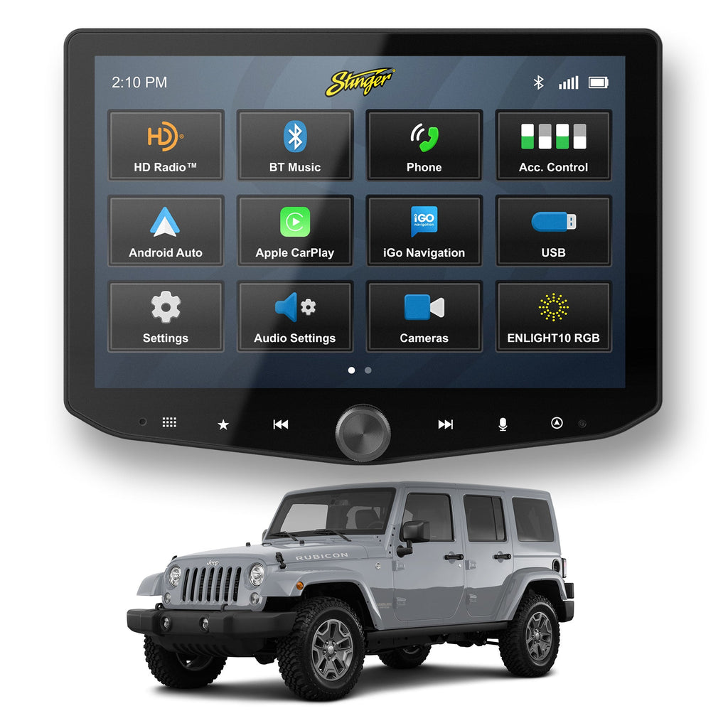 The HEIGH10+ for Jeep Wrangler JK is an elevated version of the popular Stinger HEIGH10 Radio, delivering improved functionality and integration for a factory-like look in your dashboard. Experience wireless Apple CarPlay, Android Auto, and hands-free Bluetooth, along with customizable gauges that display essential off-road data like transfer case status and altitude. The vivid 10.1" HD touchscreen, protected with anti-glare and anti-fingerprint technology, provides clear visibility in any light, while the optional iGO Nav SD card support provides network-free GPS for any off-road adventure. With 4.5Vrms 8-channel RCA outputs, subwoofer control, and a 15-band equalizer, this upgraded head unit delivers exceptional sound. The plug-and-play capability during installation and on-screen control of up to four accessories make it the perfect, upgrade for Jeep JK drivers looking for modern tech in a rugged, factory-style package.
