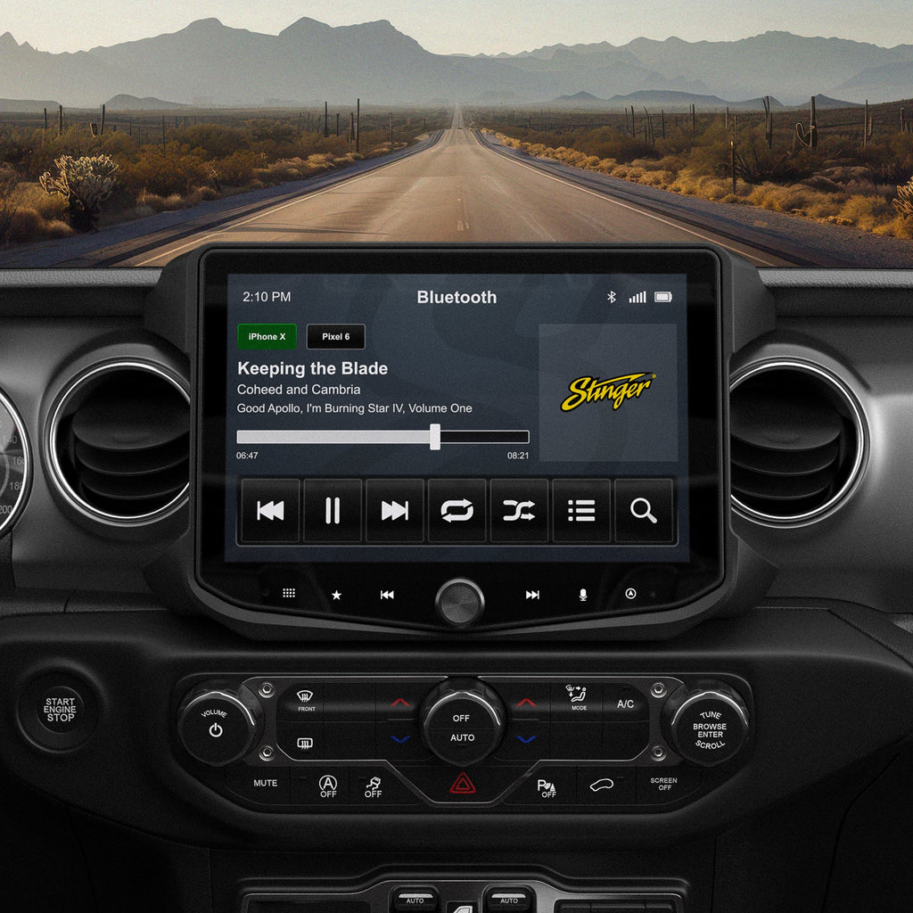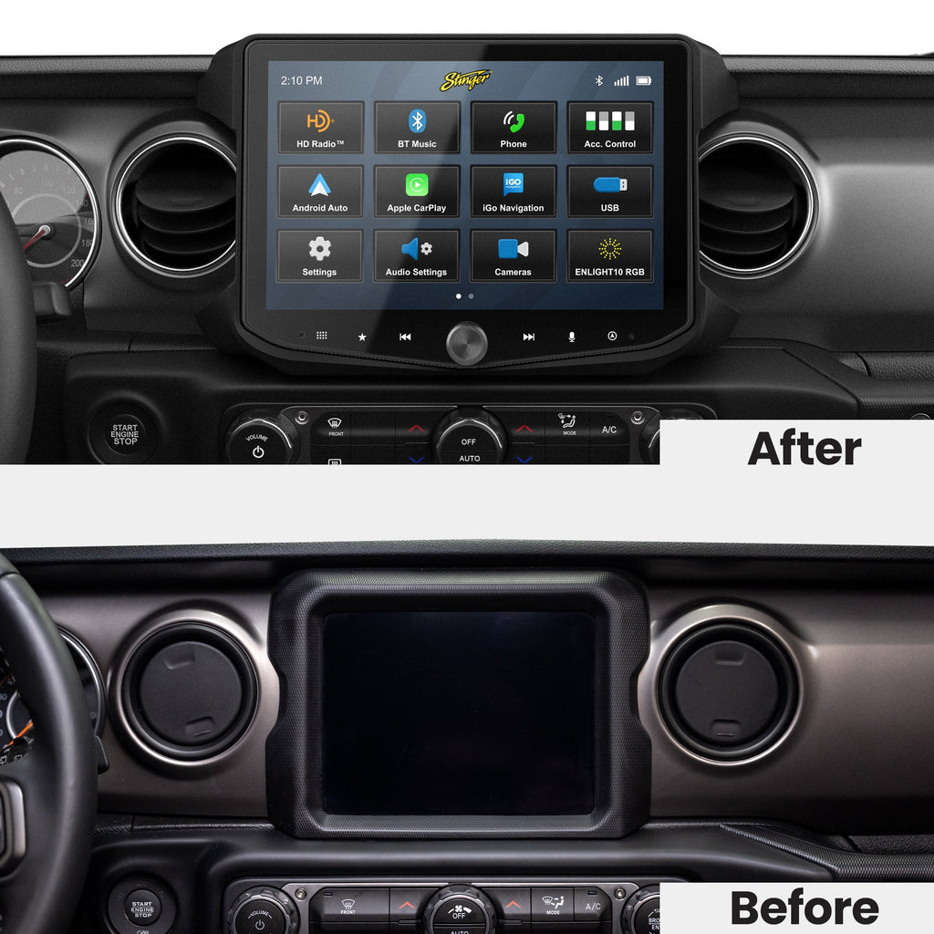 Stinger brings you the HEIGH10+ 10" Radio Kit, customized for the Jeep Wrangler JL or Jeep Gladiator JT. This head unit is an upgraded version of the popular Stinger HEIGH10 Radio, delivering improved functionality and integration for a factory-like look in your dashboard. Experience wireless Apple CarPlay, Android Auto, hands-free Bluetooth, and customizable gauges that display essential off-road data like transfer case status and altitude. The vivid 10.1" HD touchscreen, protected with anti-glare and anti-fingerprint technology, provides clear visibility in any light. The optional iGO Nav SD card support provides network-free GPS for any off-road adventure. With 4.5Vrms 8-channel RCA outputs, subwoofer control, and a 15-band equalizer, this elevated radio delivers exceptional sound. The plug-and-play capability during installation and on-screen control of up to four accessories make it the perfect, upgrade for Jeep JK drivers looking for modern tech in a stylish and convenient package.