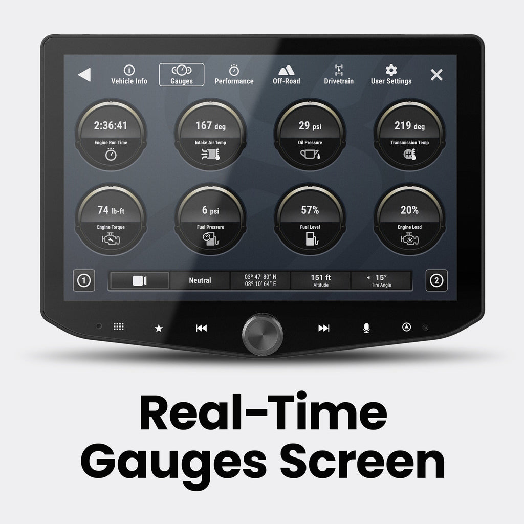 Off-Road Screen: Monitor the pitch and roll, GPS coordinates, compass, and more during your off-road adventure.