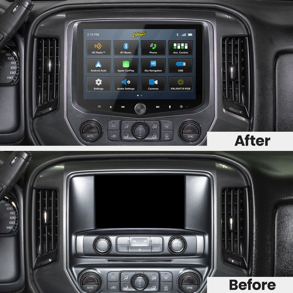 The Stinger HEIGH10+ 10" Radio Kit for Chevy Silverado & GMC Sierra is an elevated version of the popular HEIGH10, now offering more efficient functionality and design. Its flush-mount setup integrates beautifully with your dashboard, while wireless Apple CarPlay, Android Auto, and Bluetooth keep you effortlessly connected. The 10.1" touchscreen includes anti-glare and anti-fingerprint protection, HD Radio, and on-screen control for up to four accessories. With a 15-band equalizer, dedicated subwoofer control, and versatile USB, HDMI, and AV inputs, you can customize your audio experience to perfection. Plug-and-play installation, fast wake-up, and steering wheel compatibility make the HEIGH10+ the smart, feature-rich choice for every drive. COMPATIBLE WITH BOSE-EQUIPPED SYSTEMS.