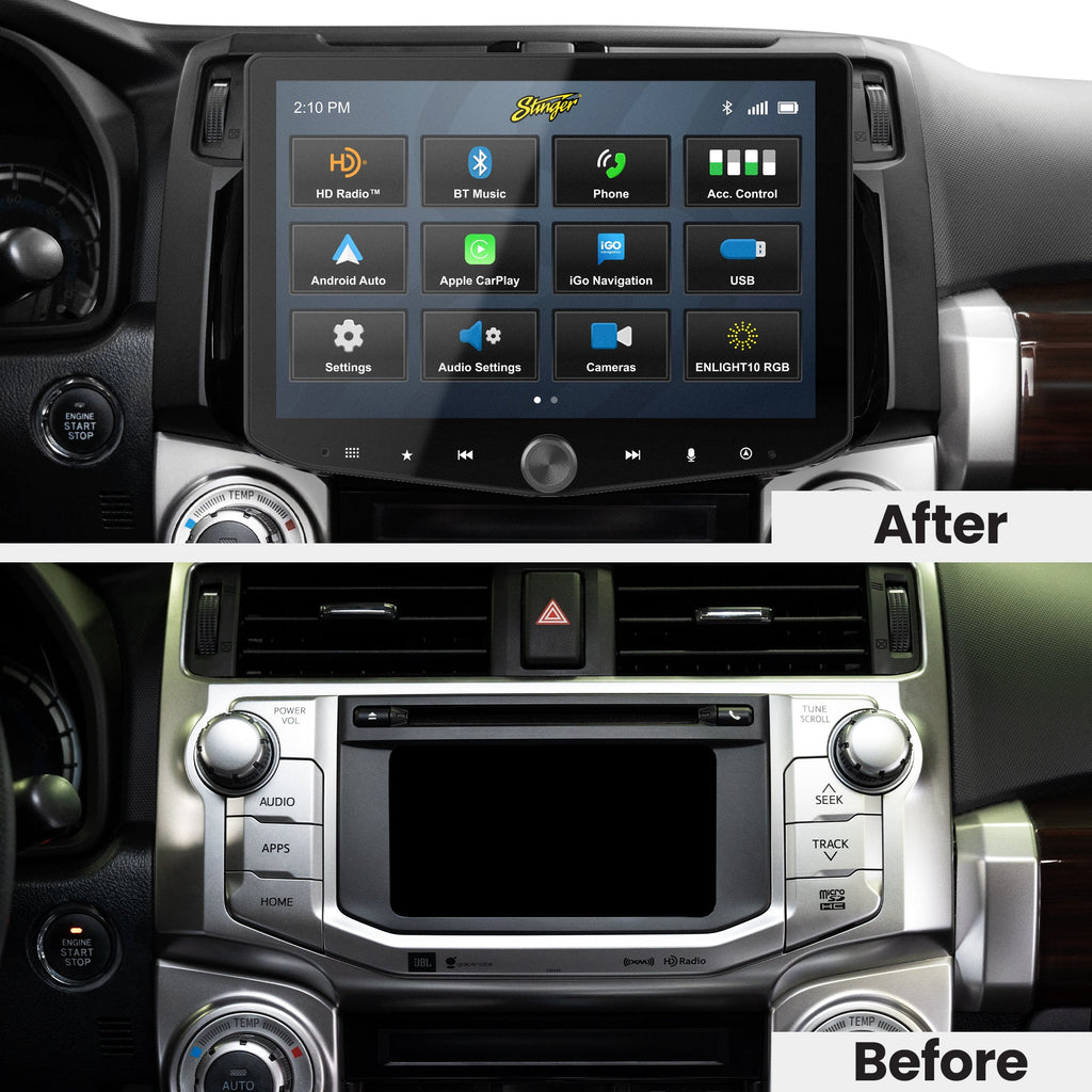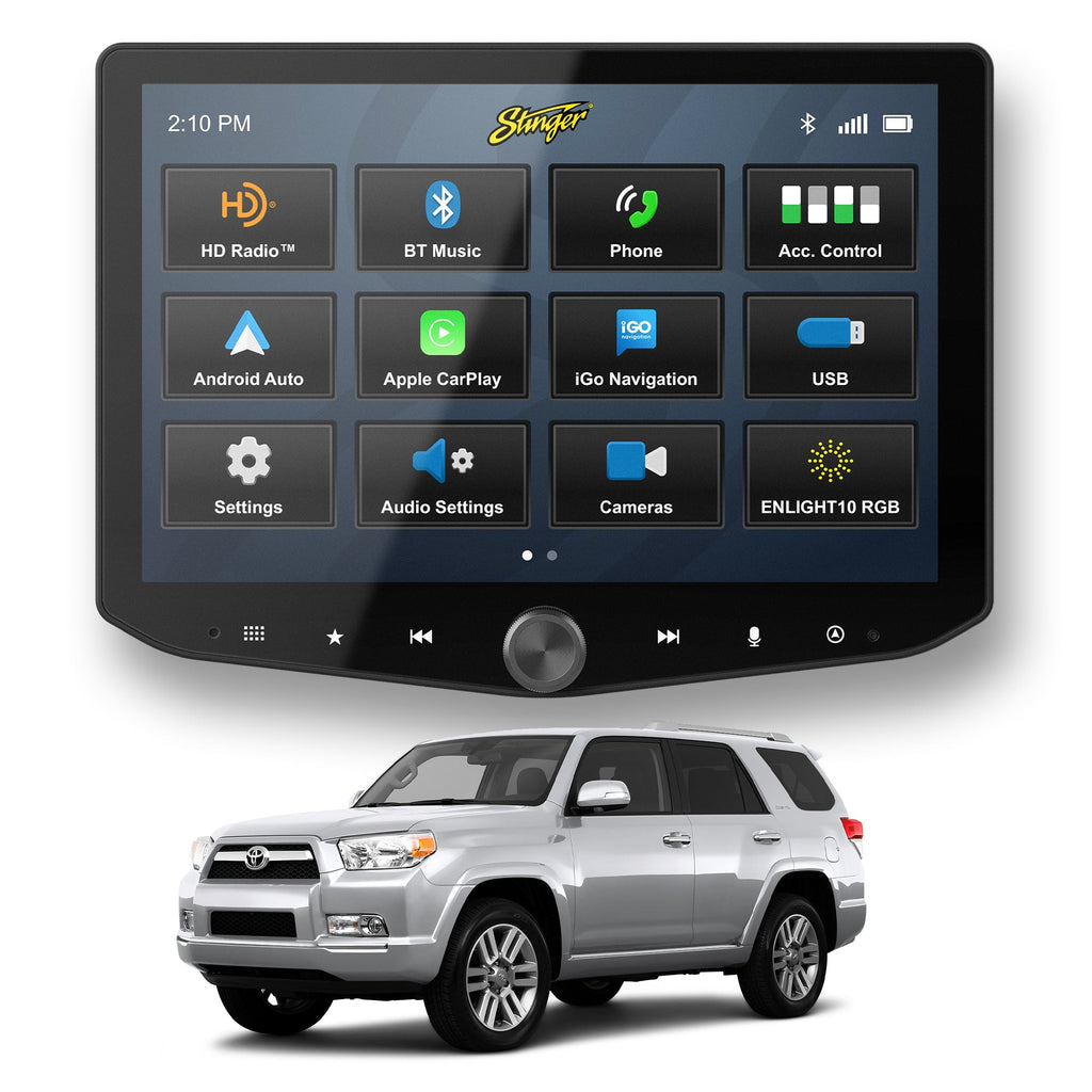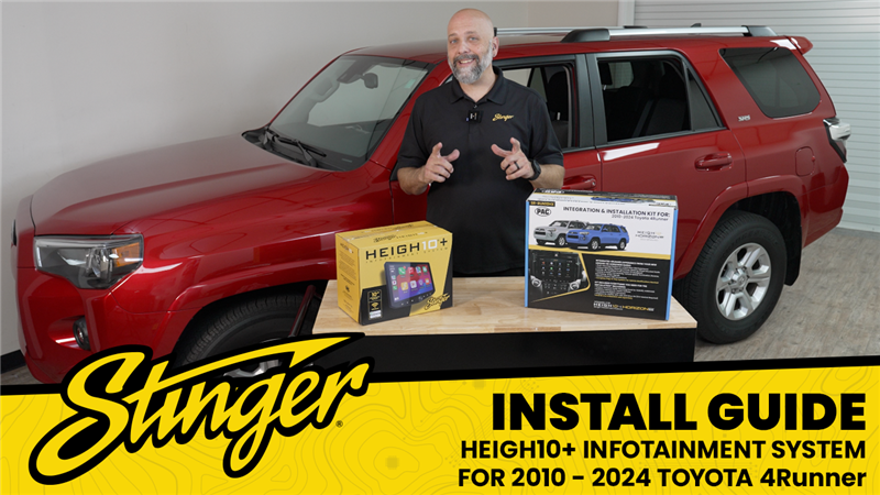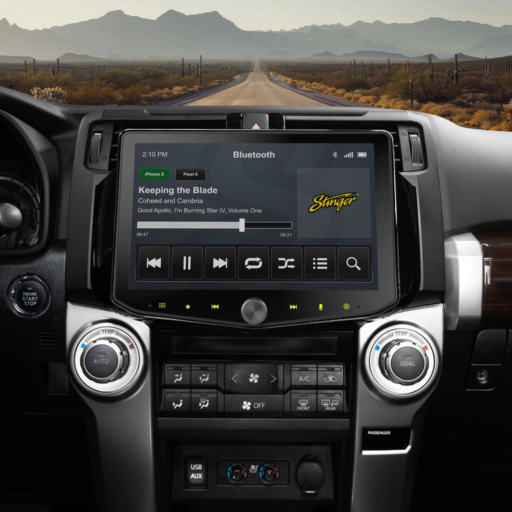 The Stinger HEIGH10+ 10" Radio Kit for Toyota 4Runner is an elevated version of the popular HEIGH10, delivering next-level connectivity and control for your SUV. Its flush-mount design integrates seamlessly into the 4Runner’s dashboard for a clean, factory-like finish. Enjoy wireless Apple CarPlay, Android Auto, and Bluetooth for easy access to your smartphone features. The high-definition 10.1" touchscreen is equipped with anti-glare and anti-fingerprint protection, HD Radio, and on-screen control for up to four accessories. Fine-tune your audio with a 15-band equalizer, dedicated subwoofer control, and versatile inputs for USB, HDMI, and AV. With plug-and-play installation, quick start-up, and compatibility with steering wheel controls, the HEIGH10+ brings a fully integrated, premium experience to every drive in your Toyota 4Runner.
