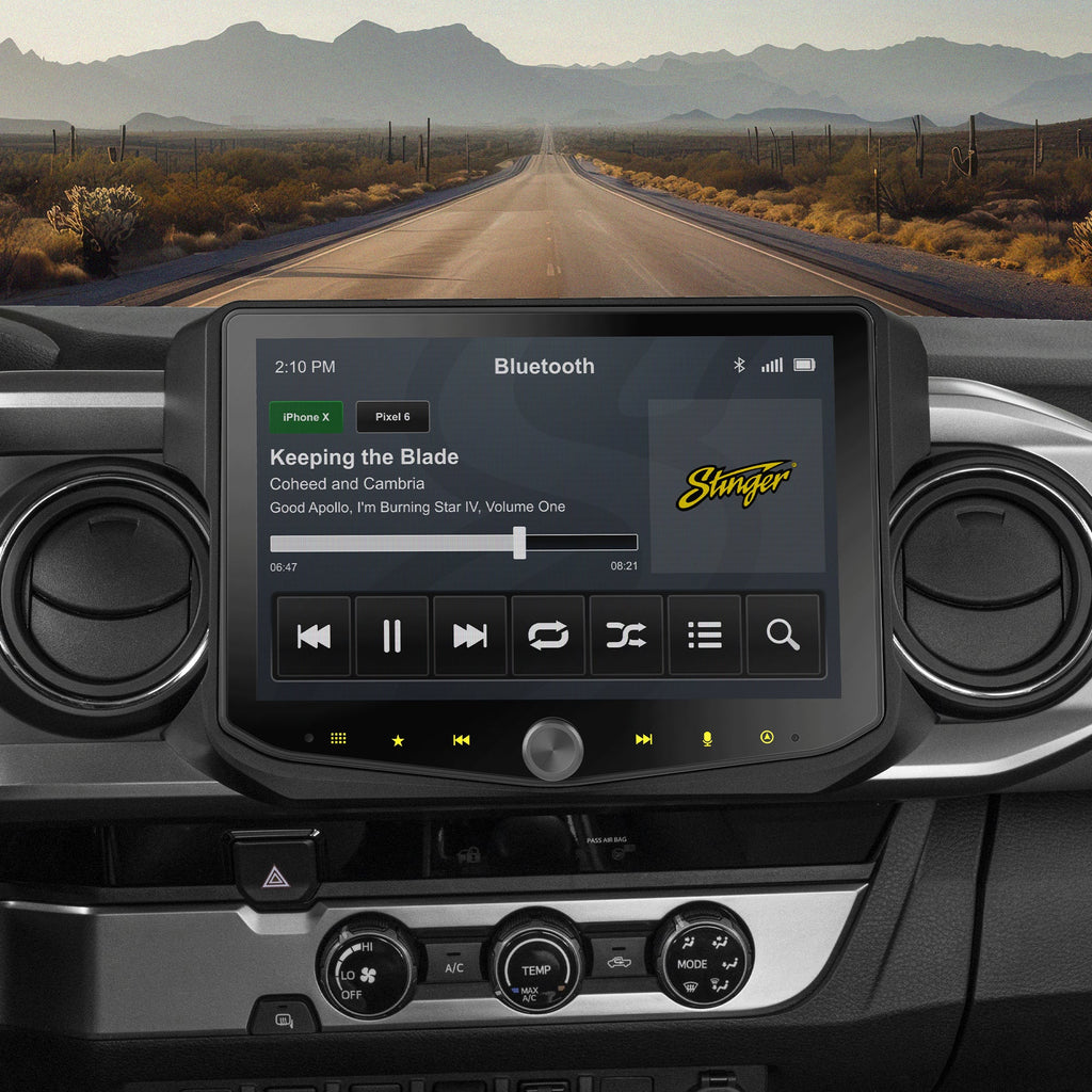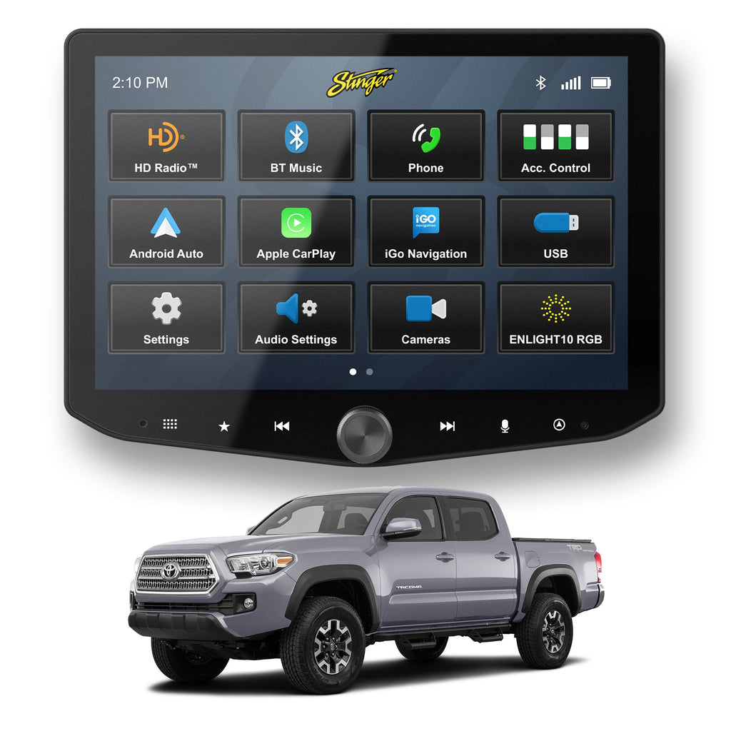 The Stinger HEIGH10+ 10" Radio Kit for Toyota Tacoma is an upgraded version of the original HEIGH10 Radio, designed to bring advanced connectivity and control to your truck. Its flush-mount design integrates perfectly into the Tacoma's dashboard, creating a factory-style look. Stay connected with wireless Apple CarPlay, Android Auto, and Bluetooth. The high-definition 10.1" touchscreen features anti-glare and anti-fingerprint protection, HD Radio, and on-screen control for up to four accessories. Customize your audio experience with a 15-band equalizer, dedicated subwoofer control, and multiple inputs for USB, HDMI, and AV. With simple plug-and-play installation, fast wake-up, and steering wheel compatibility, the HEIGH10+ makes every drive in your Toyota Truck smarter, more connected, and more enjoyable.