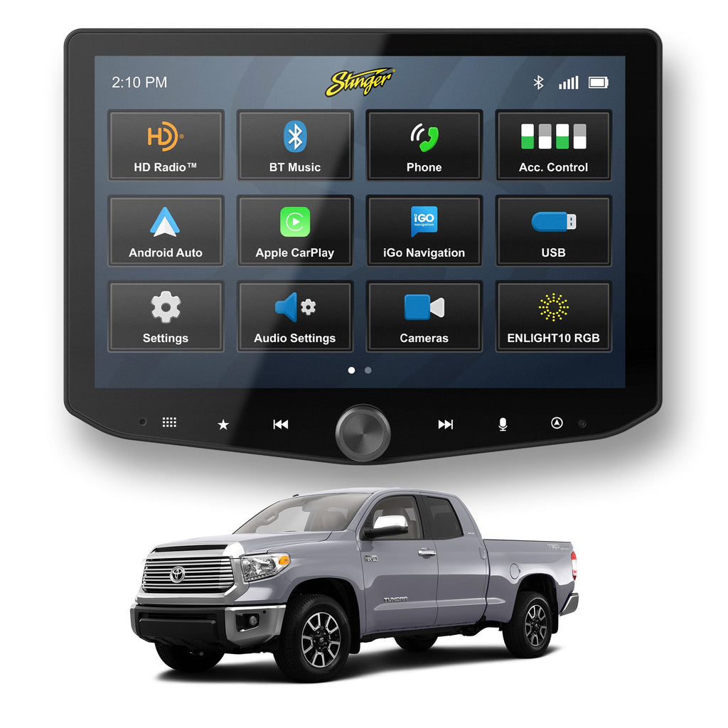 The HEIGH10+ 10" Radio Kit for Toyota Tundra is an upgraded version of the original Stinger HEIGH10, offering enhanced connectivity and features for a flush-mounted experience. Enjoy wireless Apple CarPlay, Android Auto, and Bluetooth on a 10.1" HD touchscreen with anti-glare, anti-reflection, and anti-fingerprint protection. Enhanced 4.5Vrms 8-channel RCA outputs, subwoofer control, and a 15-band equalizer deliver powerful, customizable sound. Installation features plug-and-play capability with easy integration into the Tundra’s wiring, plus steering wheel control compatibility for effortless access, making this the ultimate upgrade in tech and style.