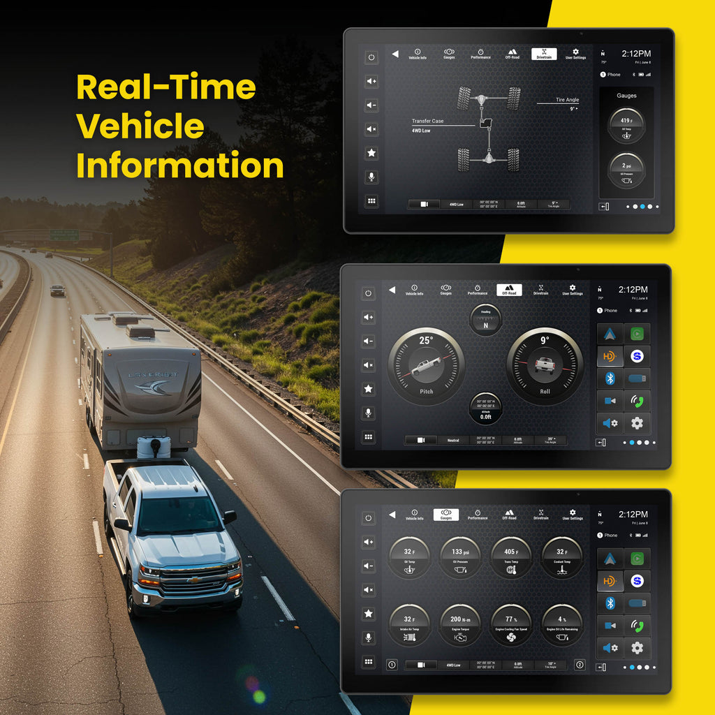 Take your Chevy Silverado or GMC Sierra truck to the next level with a real-time information display built for everyday driving and with towing in mind. It’s designed to handle the elements, featuring a massive 12.8" optically bonded screen that resists dust, dirt, and moisture. Personalize your setup with a dynamic multi-zone interface—add your most-used widgets, customize backgrounds and colors to match your style. Stay confident while towing with support for four camera inputs, compatible with both AHD and standard resolutions—perfect for monitoring trailers, blind spots, and rear views. Whether you're hauling heavy loads, hitting the trails or heading out on the highway, this display delivers rugged reliability, smart functionality, and a fully customizable experience.