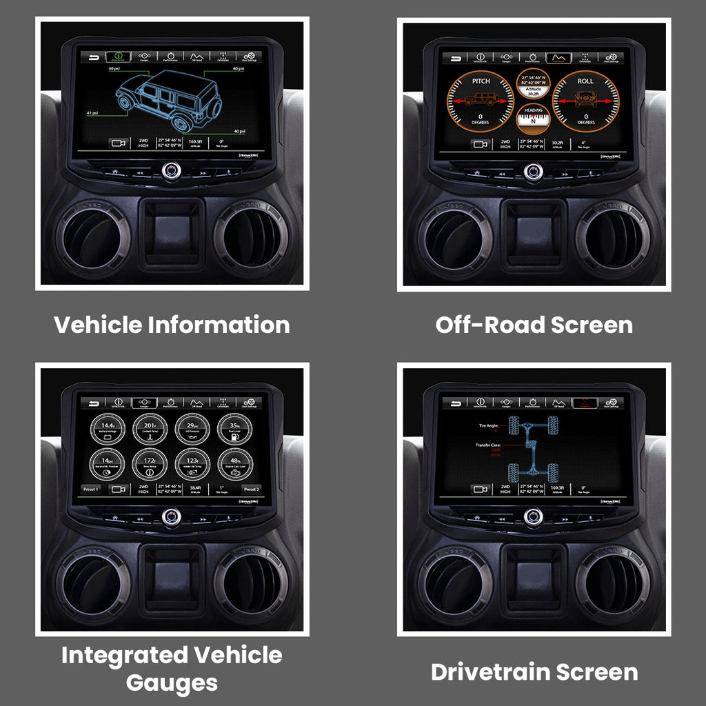 On-Screen Vehicle Information & Gauges: Vehicle-specific screens and apps with many user customizations. All are enhanced with off-road data, including transfer case, current position (latitude/longitude), altitude, steering angle, and more.