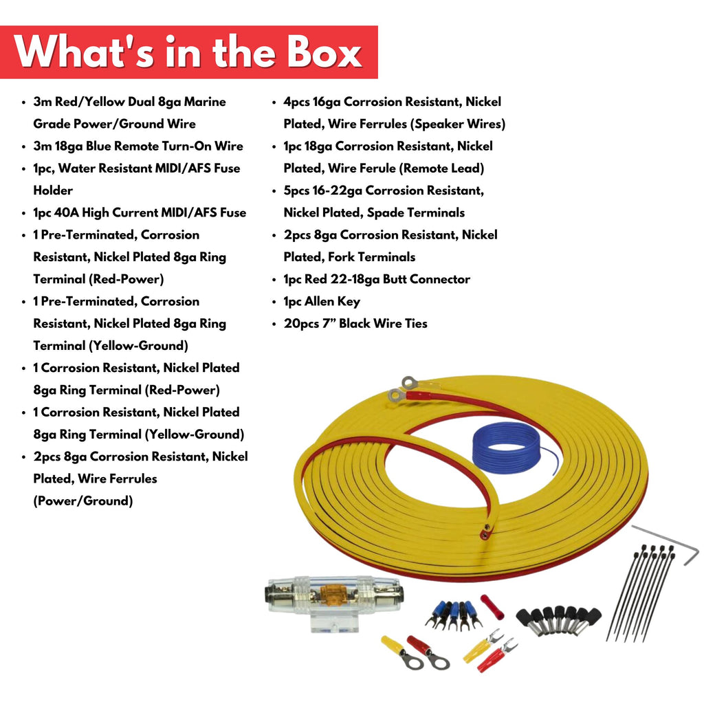 The Stinger Marine dual power and ground wire surpasses all UL1426 marine standards. To ensure safety and ease of installation, we utilize a marine-standard color coding scheme with red denoting power and yellow indicating ground. Each kit includes all essential accessories for a professional-grade installation. Incorporate a Stinger Marine Interconnect in the desired length, tailored to your installation needs. Experience marine wiring like never before with our state-of-the-art Stinger Marine Wiring Kit.