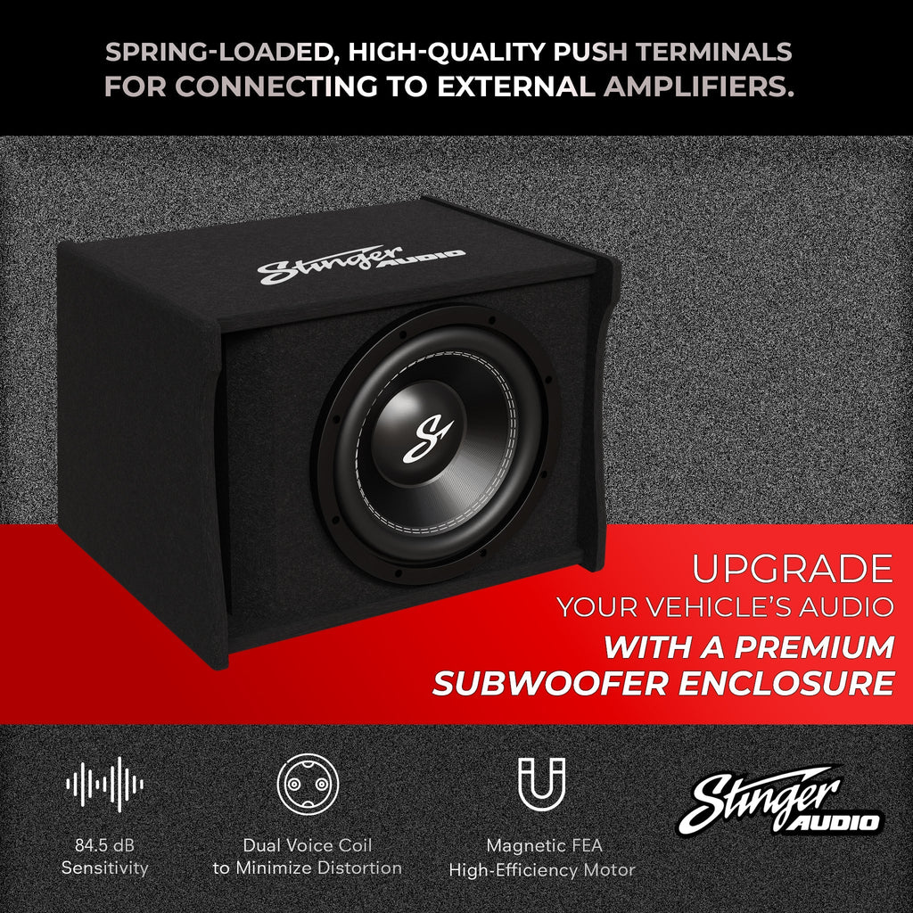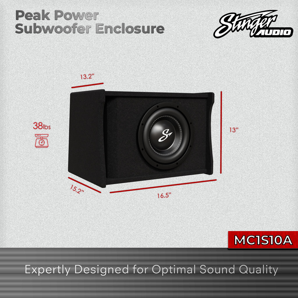 Experience the power and precision of the MC1 Series by Stinger Audio. Designed specifically for loaded, ported subwoofer enclosures, this addition to your car sound system will elevate your audio to new heights. With a peak power of 1,200 watts and a 10" subwoofer, the MC1 series delivers deep, rich bass that will make every beat come alive. Built to last with robust construction and durable materials, this subwoofer enclosure is ready to withstand the demands of daily use. Its perfect fit for most vehicles and preloaded high-quality subwoofers ensure a seamless and satisfying audio experience right out of the box. Boost your ride audio with the MC1 Series Loaded Subwoofer Enclosure from Stinger Audio!