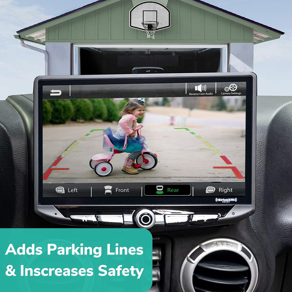 Using your new radio replacement monitor with navigation, this simple plug-in-play product includes everything you need to add a new backup camera. The camera provides parking guidelines and a clear video image with AHD/CVBS resolution, and super-wide 170-degree viewing angle behind your Jeep.