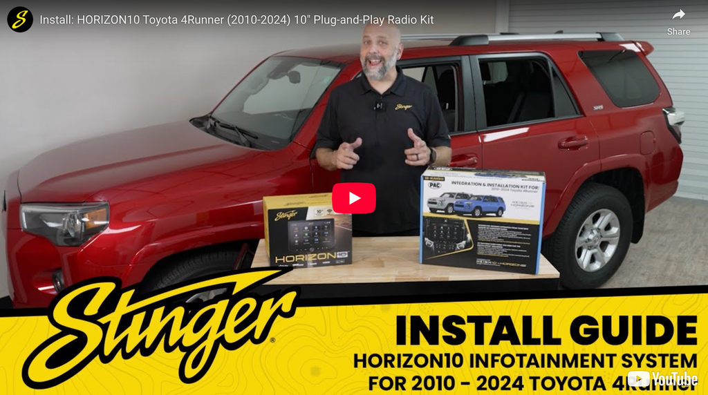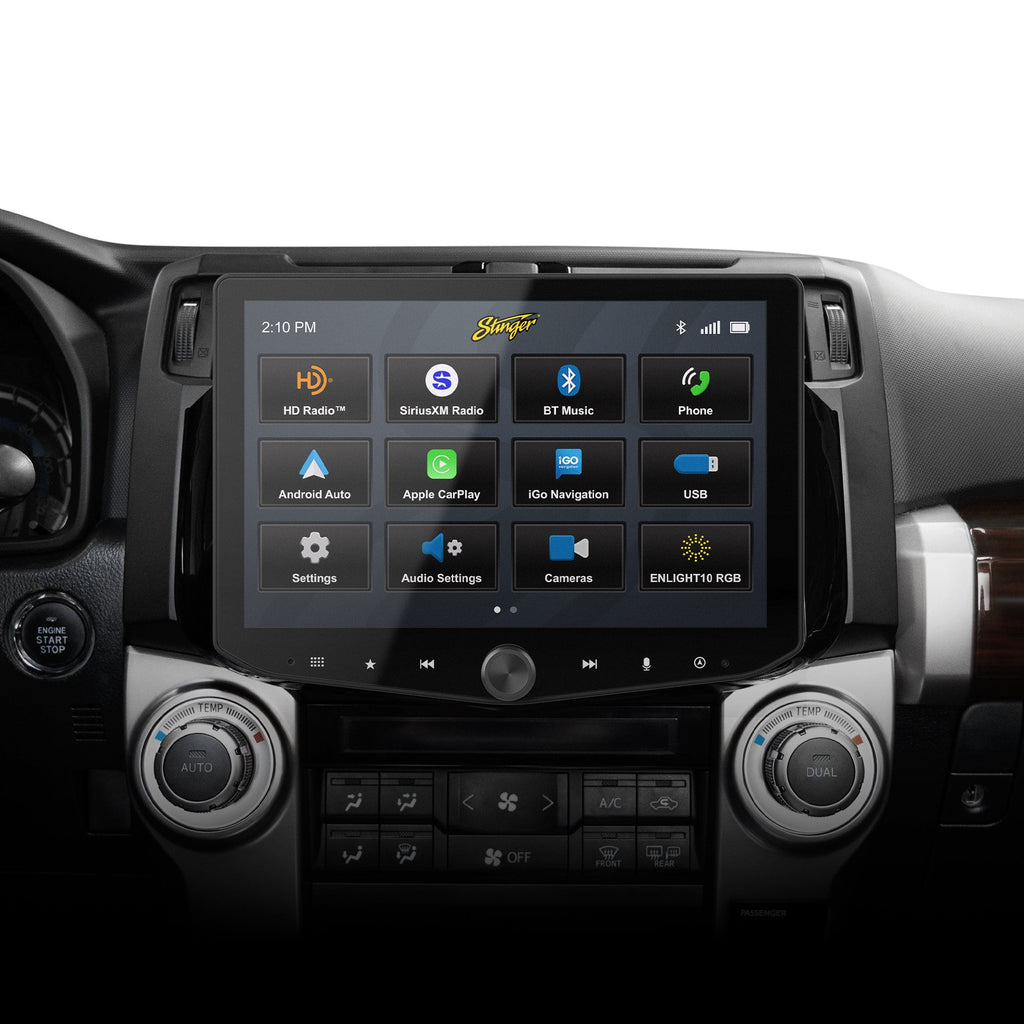 Transform your Toyota 4Runner driving experience with the Stinger HORIZON10 10" Radio Plug-and-Play Kit. This premium kit features a 10.1" HD touchscreen engineered to resist glare, reflection, and fingerprints, ensuring a clear and vibrant view in any lighting condition. Easily connect with hands-free Bluetooth and enjoy the convenience of wireless Apple CarPlay and Android Auto. Whether navigating local streets or tackling rugged trails, the IP65 weather-resistant display is built for durability and performance. Immerse yourself in high-fidelity audio with rich, detailed sound, and explore a wide range of entertainment options with SiriusXM-Ready capabilities (SiriusXM Connect Vehicle Tuner and subscription required). Navigate with precision using the optional iGO Navigation via a Micro-SD card slot (SD card sold separately) and manage up to four accessories directly from the user-friendly display. The Stinger HORIZON10 combines state-of-the-art technology, robust durability, and exceptional sound quality, delivering an unparalleled and connected driving experience.