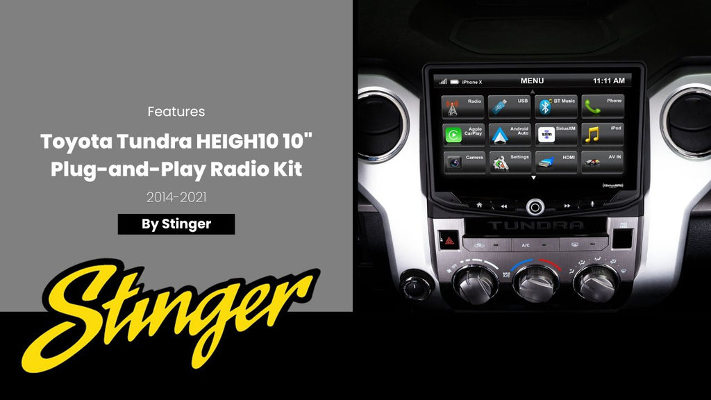 Elevate your driving experience to new heights with the Stinger HEIGH10 10” Radio Kit, designed for Toyota Tundra owners who appreciate the finer things in life. Immerse yourself in luxury as this advanced kit enhances visibility and ergonomics. Seamlessly integrate your smartphone with Apple CarPlay and Android Auto (wired connection), accessing map navigation, phone contacts, notifications, and more! Stream music and make handsfree calls with the 10" high-definition touchscreen and Bluetooth functionality. Safety is key, so the HEIGH10 radio boasts multiple camera inputs to eliminate blind spots, reducing risk and ensuring a smooth ride. Get to your destination effortlessly with the integrated GPS navigation that functions even in areas with limited data or no cell phone coverage. With every detail considered, the Stinger HEIGH10 Kit is the ultimate upgrade, packaged with everything you need for installation! Compatible years: Toyota Tundra 2014, 2015, 2016, 2017, 2018, 2019, 2020, 2021.