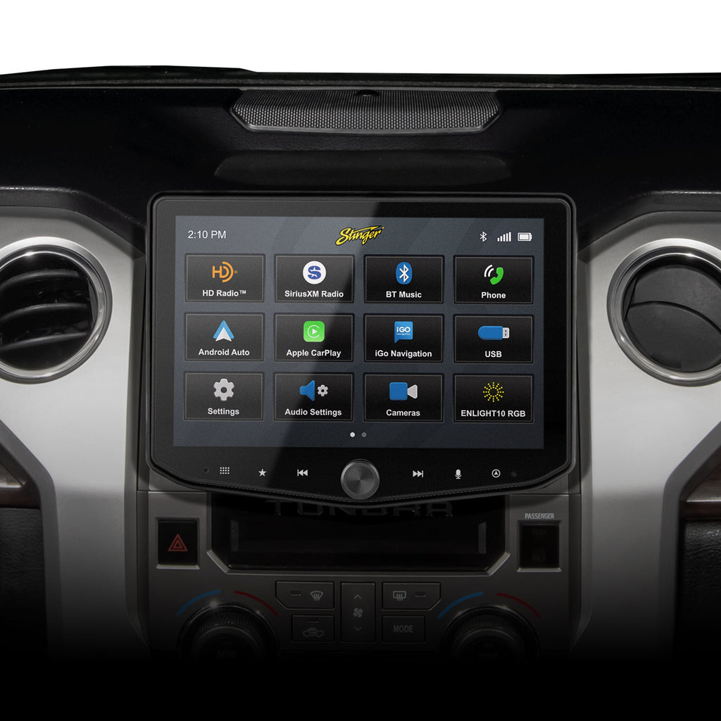Transform your Toyota Tundra driving experience with the Stinger HORIZON10 10" Radio Plug-and-Play Kit. This premium kit features a 10.1" HD touchscreen that resists glare, reflection, and fingerprints, ensuring a clear and sharp view in any lighting condition. Enjoy seamless connectivity with advanced Bluetooth and the smooth integration of Apple CarPlay and Android Auto. Whether you're navigating urban streets or off-road paths, the IP65 weather-resistant display is engineered to endure any journey. Experience high-fidelity audio for rich and detailed sound, and explore a vast range of entertainment options with SiriusXM-Ready capabilities (SiriusXM Connect Vehicle Tuner and subscription required). Navigate confidently with the optional iGO Navigation via a Micro-SD card slot (SD card sold separately) and control up to four accessories directly from the display. The Stinger HORIZON10 is a masterful combination of innovative technology, durable construction, and exceptional sound quality, providing a truly enhanced and connected driving experience.